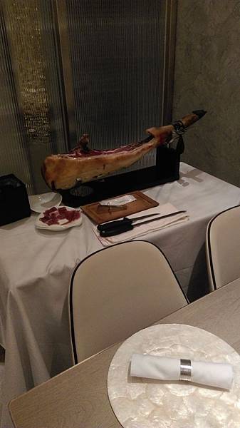 有一處獨立包廂,同樣保留挑高的牆面,適合6~8人小團體私密聚會,而且能夠以臉貼臉的近距離感受黑標5J伊比利生火腿的桌邊秀。