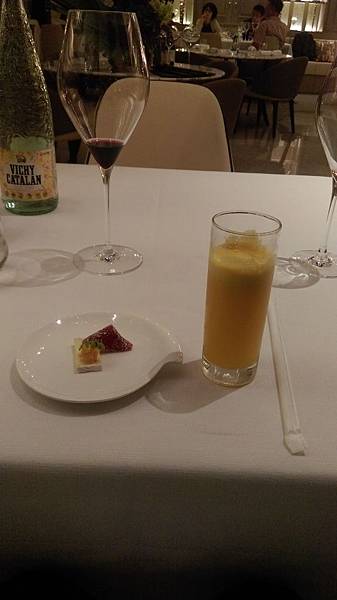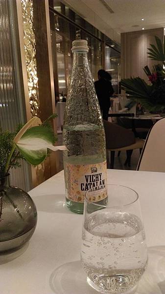 用餐之前,可以選擇用餐之間的水。經過推薦,稍帶鹽味的VICHY CATALAN將陪伴這一頓豐盛的晚餐,並擔當料理之間滋潤口腔的重責大任。