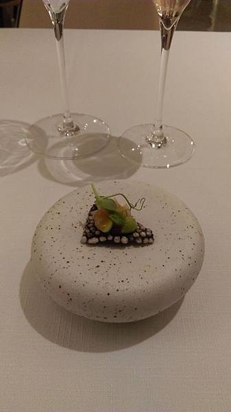 前菜是一道精緻的小品,以溫潤原石為盤,上頭是墨魚汁米果脆片烘托著澎湖蔬菜與香橙的清新。