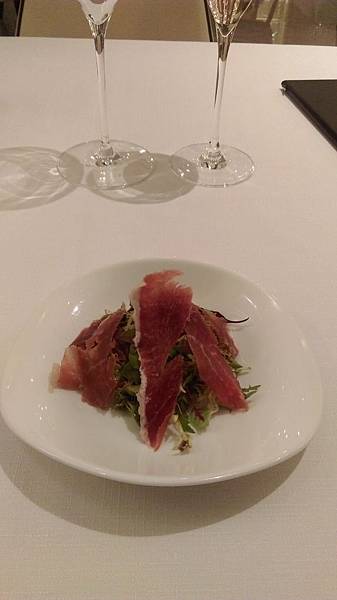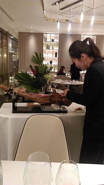 此時,美麗優雅的店長帶來桌邊服務,巧手之間已讓黑標5J的薄片在小皿中與蔬菜疊合,五星級的火腿香就這麼濃濃繚繞久久不散。