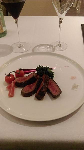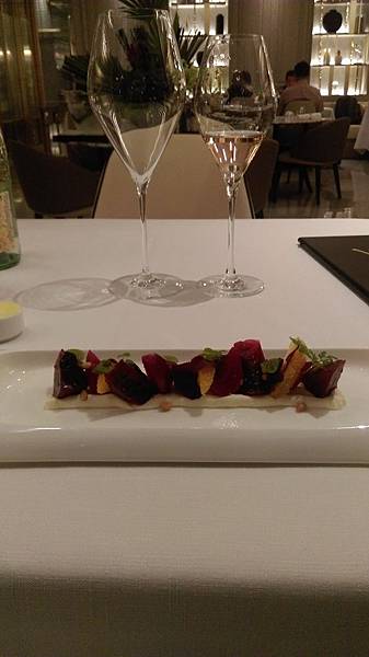 開胃小品是甜菜根酸奶優格沙拉,獨到之處在於兩種甜菜的運用,營造了一深一淺、一隱一顯的殷紅層次,搭配香吉士與希臘優格所濃縮的酸勁,真是令人胃口大開。