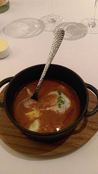 湯品是特製的法式龍蝦濃湯,醇濃高湯交融著奶泡,龍蝦在暗香之間浮出,暖香滋味從鼻腔直到喉頭,直直墜入腸胃腑臟,就像疏通筋脈一般的通體舒暢。