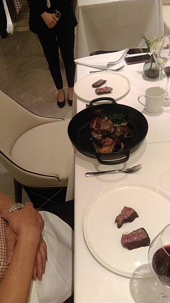 隔壁桌剛好在測試鐵鍋丁骨牛排的800度炙熱考驗,一陣猛熱煙霧之後,呈現的是莫邪寶劍經過鑄燒淬鍊般的內斂光澤。油光閃閃,但閃光中卻是香氣陣陣。