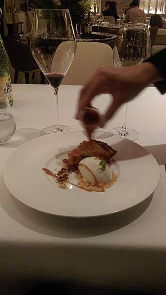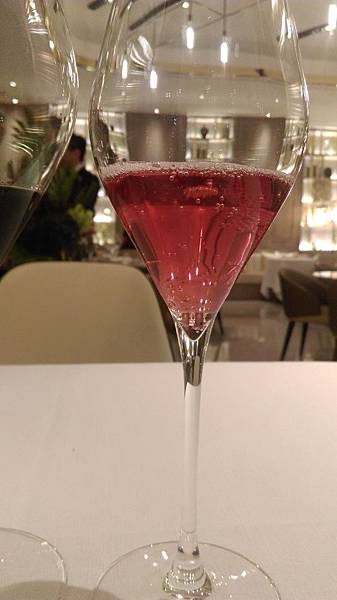 主餐之後,透過侍酒師的介紹,氣質冷酷卻蘊藏著少女天真的粉紅甜酒Cerdon即將總結這次饗宴。搭配甜點的酒不易得,但這杯帶著少女心的粉紅泡泡,卻能將清新氣息恰到好處滲入甜味之中,顯得無比熱鬧又不失分寸。